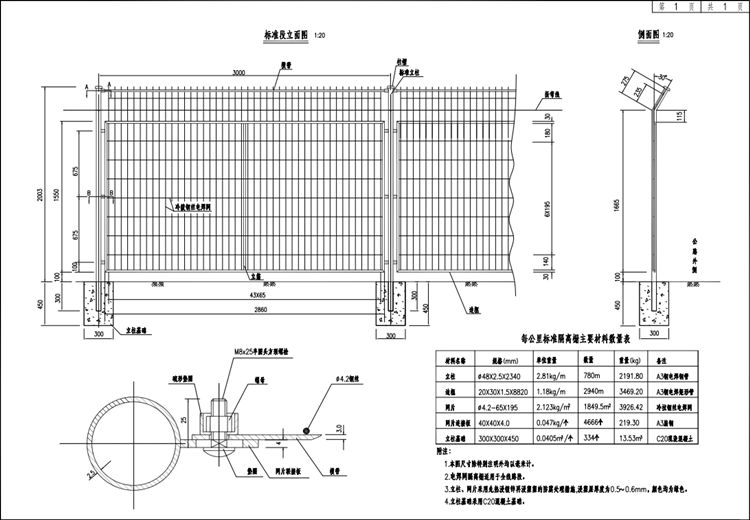 焊接網(wǎng)隔離柵采用直徑4mm鋼絲焊制,網(wǎng)片規(guī)格75×150mm。其力學(xué)性能應(yīng)符合 YB/T 5294-2009的規(guī)定。焊接網(wǎng)隔離柵立柱采用φ48 立柱。立柱與掛鉤點(diǎn)焊固定成整體后采用先鍍鋅后浸塑防腐處理,鋼絲網(wǎng)片鍍鋅防腐,鍍鋅量應(yīng)高于 120g/㎡,立柱設(shè) C20 混凝土基礎(chǔ)。 隔離柵立柱、斜撐等鍍鋅量應(yīng)高于450g/㎡。