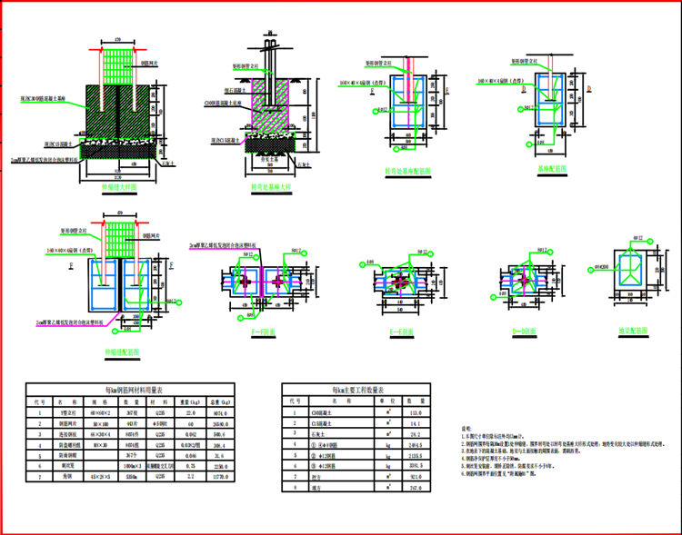 鋼筋網(wǎng)刺鐵絲圍界主要由刺絲滾網(wǎng)、立柱、網(wǎng)片、地梁、邊框、現(xiàn)澆鋼筋混凝土基礎(chǔ)構(gòu)成。立柱(矩形鋼管,60mmX60mmX2mm)與網(wǎng)片構(gòu)成鋼筋網(wǎng)刺鐵絲圍界的主體,鋼筋網(wǎng)片四周用45mmX28mmX5mm角鋼加固。外側(cè)鋼筋網(wǎng)刺鐵絲圍界每根立柱的總高度(不含埋深長度)為3.46m,頂部設品字形刺絲滾網(wǎng)防攀爬(直徑500mm),地面以上總高度為3.78m;內(nèi)側(cè)鋼筋網(wǎng)刺鐵絲圍界每根立柱的總高度(不含埋深長度)為2.53m,頂部設一道刺絲滾網(wǎng)防攀爬(直徑500mm),地面以上總高度為2. 85m。在兩道鋼筋網(wǎng)刺鐵絲圍界鋼筋網(wǎng)片底部均加1lm 高密集網(wǎng)片,由Φ3浸塑鋼絲制作,網(wǎng)片尺寸12.5X 100mm,與鋼筋網(wǎng)片采用電焊連接,以防止小動物鉆爬。兩道鋼筋網(wǎng)刺鐵絲圍界的立柱間距均為3.0m,地梁橫斷面尺寸為24cmX30cm,采用現(xiàn)澆C30鋼筋混凝土地梁?;A(chǔ)自上而下依次為45cmX45cmX80cm現(xiàn)澆C30鋼筋混凝土基座、10cm厚C15混凝土、20cm厚石灰土,石灰土中石灰含量不低于12% (質(zhì)量比),壓實度不小于95% (重型擊實),土基壓實度不小于93% (重型擊實)。在鋼筋網(wǎng)刺鐵絲圍界外側(cè)每150m設置一處醒目的禁止翻越警告標識牌,標識牌內(nèi)容應清晰可見。