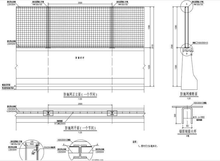 13.本圖數(shù)量表中數(shù)量按柵欄一個(gè)節(jié)間2米考慮,未計(jì)損耗,防拋網(wǎng)設(shè)置范圍為:第1~第3跨,順橋向單側(cè)長度120m。