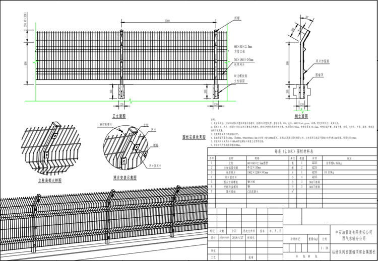 2、折彎式金屬圍欄立柱、網(wǎng)片、連接扣卡均采用成型后整體后熱鍍鋅,鍍鋅后噴塑處理的防銹處理,鋅層厚度≥60um,噴塑層厚度≥0.15mm,噴塑表面平整、表面平整、美觀,無(wú)針孔、開裂、漏塑、塑液流淌等不良現(xiàn)象。