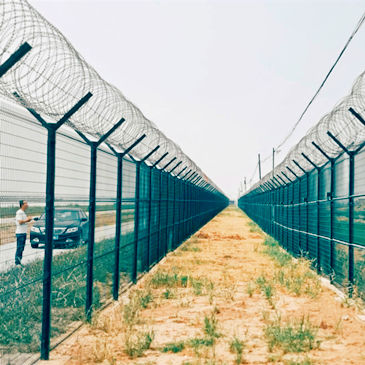 8. 防攀爬金屬隔離網(wǎng)頂部設(shè)一道蛇腹型刀刺網(wǎng),刀刺網(wǎng)材質(zhì)為304不銹鋼,圈徑不小于600mm,每米長度不少于7圈,圈距排列均勻,刀片形式為BTO-22(芯線直徑為2.5±0.1mm,刀片厚0.5±0.05mm,刀片長22±1mm,刀片寬15±1mm,刀片間距為36±1mm)。