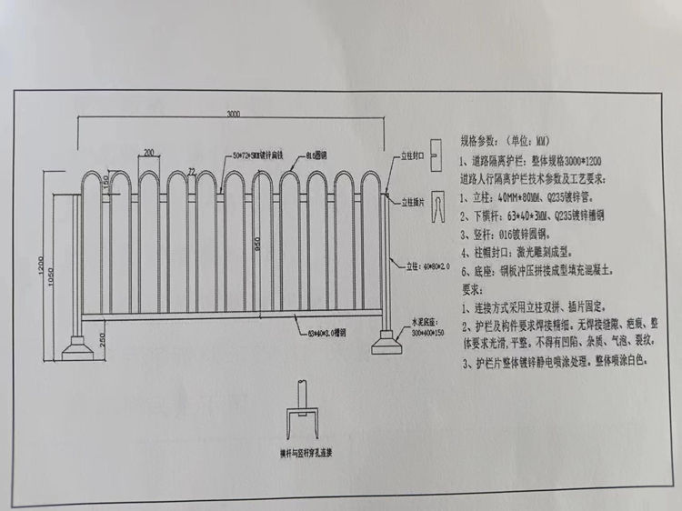 1、市政道路人行隔離護(hù)欄整體規(guī)格3000*1200。