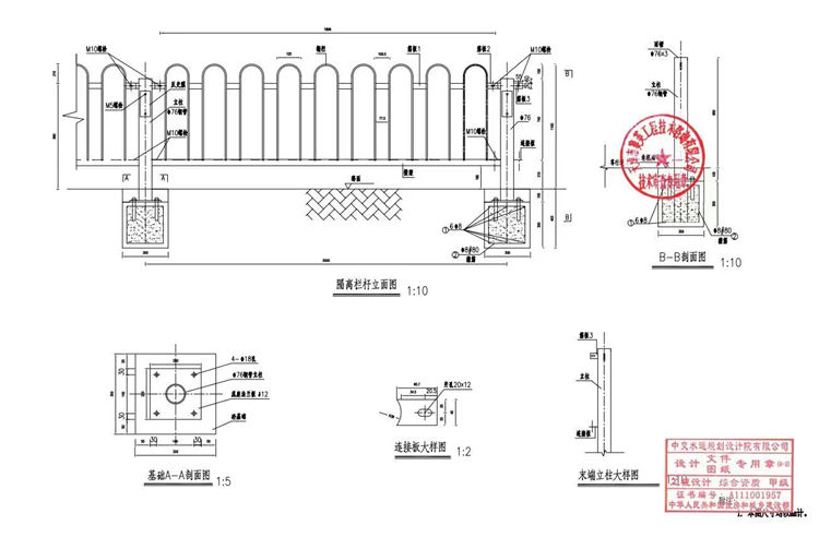 3、立柱和道路護(hù)欄分別成型:道路護(hù)欄采用圓鋼、槽鋼、扁鋼焊接成型,道路護(hù)欄每2米為一個(gè)單元,底座與立柱焊接成整體。