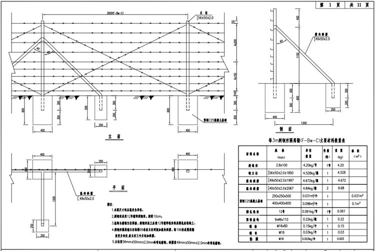 5.刺鋼絲隔離柵立柱采用56×50×2.0×1850mm槽鋼,斜撐選用49X50X2.5冷彎等邊槽鋼。刺鋼絲隔離柵熱鍍鋅噴塑防腐處理,鋼構(gòu)件鍍鋅量為 275g/㎡,涂塑層厚度大于76μm。立柱安裝間距設(shè)置為3m。刺鋼絲采用12號(hào)鍍鋅鋼絲,刺鋼絲鍍鋅量為 120g/㎡。刺絲間距4×15+4×20?;A(chǔ)混凝土為C30,尺寸400×400×600。按新規(guī)范增加刺鋼絲隔離柵小門。
