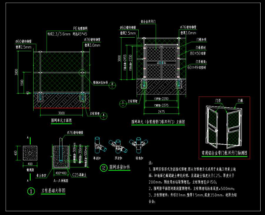 9、圍網(wǎng)安裝形式為直插式預(yù)埋,圖示為預(yù)埋方式適用于未施工的素土地面,如地面已做混凝土硬化處理,且混凝土強度大于C25、厚度大于200mm,則改用水鉆取預(yù)埋孔,立柱預(yù)埋孔?150。