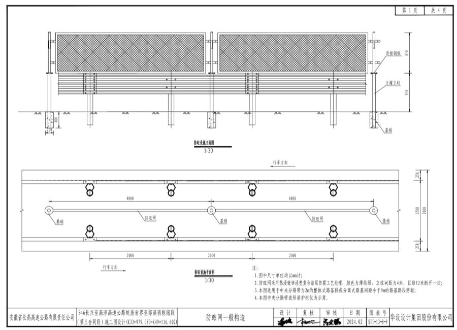 3.支撐立柱、橫梁、連接鋼板等鋼構(gòu)件采用熱浸鍍鋅浸塑復(fù)合涂層防腐處理,鍍鋅量為275g/㎡,緊固件的鍍鋅量為120g/㎡,浸層厚度大于0.25mm。顏色為薄荷綠;支撐間距為4米,且防眩網(wǎng)每12米斷開一次。