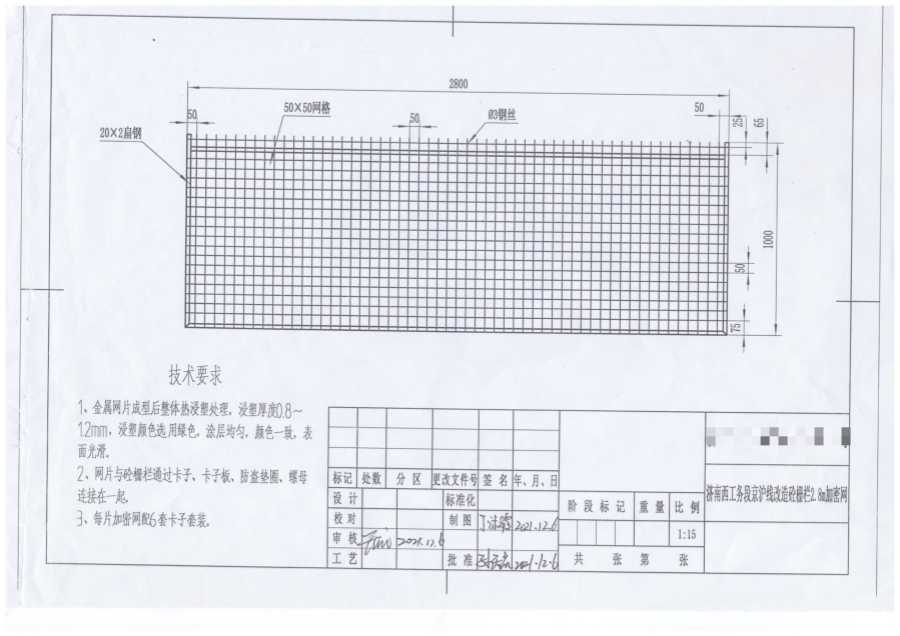 1、金屬網(wǎng)片成型后整體熱浸塑處理,浸塑厚度0.8~1.2mm,浸塑顏色選用綠色,涂層均勻,顏色一致,表面光滑。