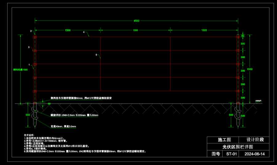 6.采用螺旋鋼樁φ48x2.5mm長550mm露頭50mm,φ42刺繩柱與預(yù)埋鋼管插接80mm,用M12對穿防盜螺栓固定。