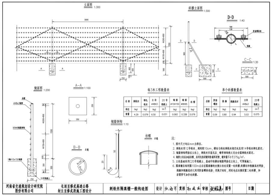 2.刺鐵絲用12號鐵絲,刺間距10cm,橫向與斜向刺鐵絲相交處應(yīng)用14號鐵絲綁扎固定。