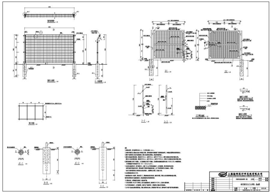 2.本圖所示圍欄及大門做法僅為施工參考的施工圖案,最終應(yīng)根據(jù)所訂購的圍欄廠家提供的基礎(chǔ)形式,詳細做法及圍網(wǎng)的花型等進行施工。
